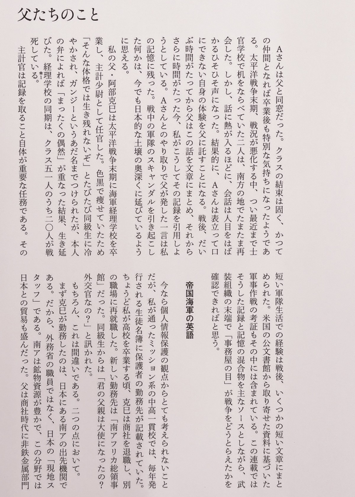 『群像』連載の「父たちのこと」が今月発売の2026年1月号で完結した。全11回。隔月にしたので約2年の連載となったが、終始、自分にこうした内容のことを書く資格があるのか、ためらいがあった。とりわけ、第1回で扱った海軍のスキャンダル=捕虜虐殺(「ビハール号事件」)は、あまりに内容が重く、関係者の名前に言及することもはばかられた。ウェブで公開されている裁判記録を見ると、責任を問われた海軍上層部の人たちの間で、責任の押し付け合いがあったことがわかる。裁判中、被告と通訳の意思疎通が十分でないと思われる箇所があって生々しい。そして、何といっても、現場に居合わせたクラスメートから父が聞いた殺害現場の凄惨さは想像をこえていた。